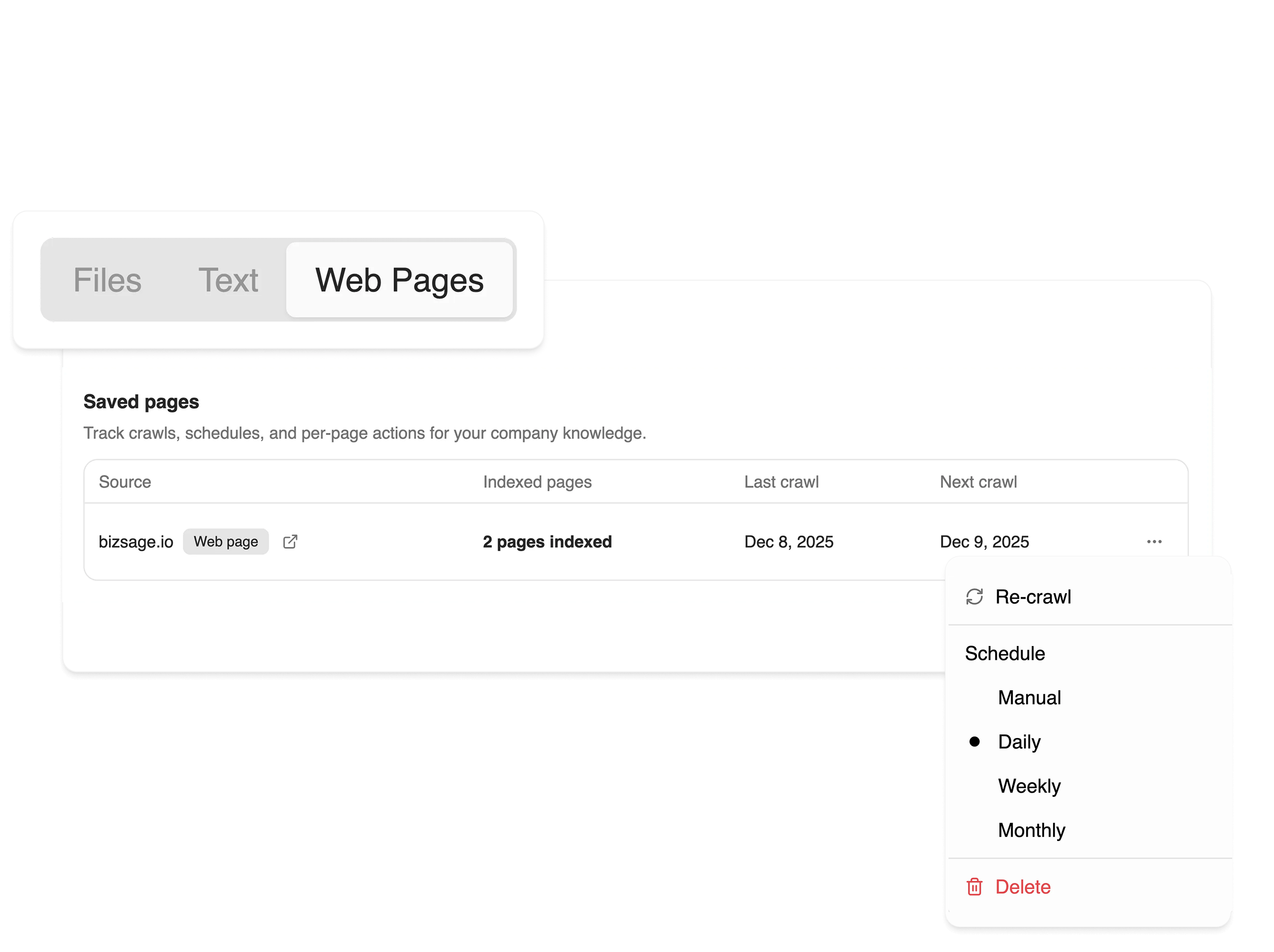 Schedule re‑crawls daily, weekly, or monthly, and re‑upload files anytime. Updates flow to all linked agents.