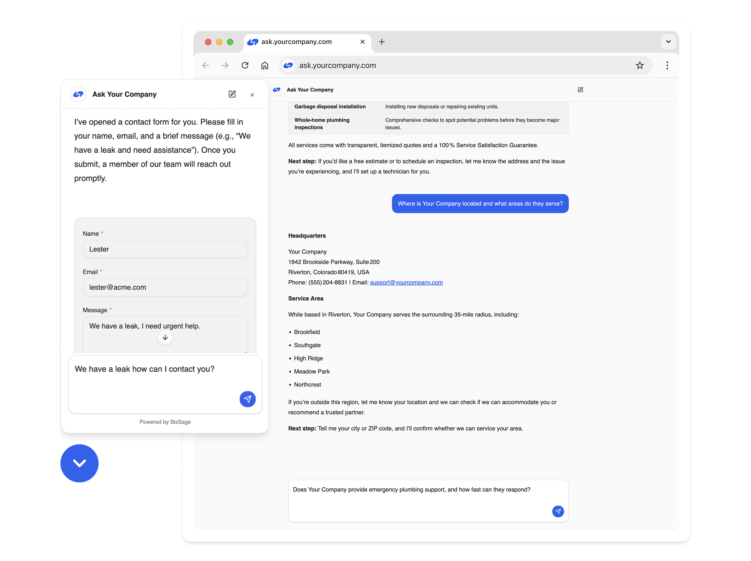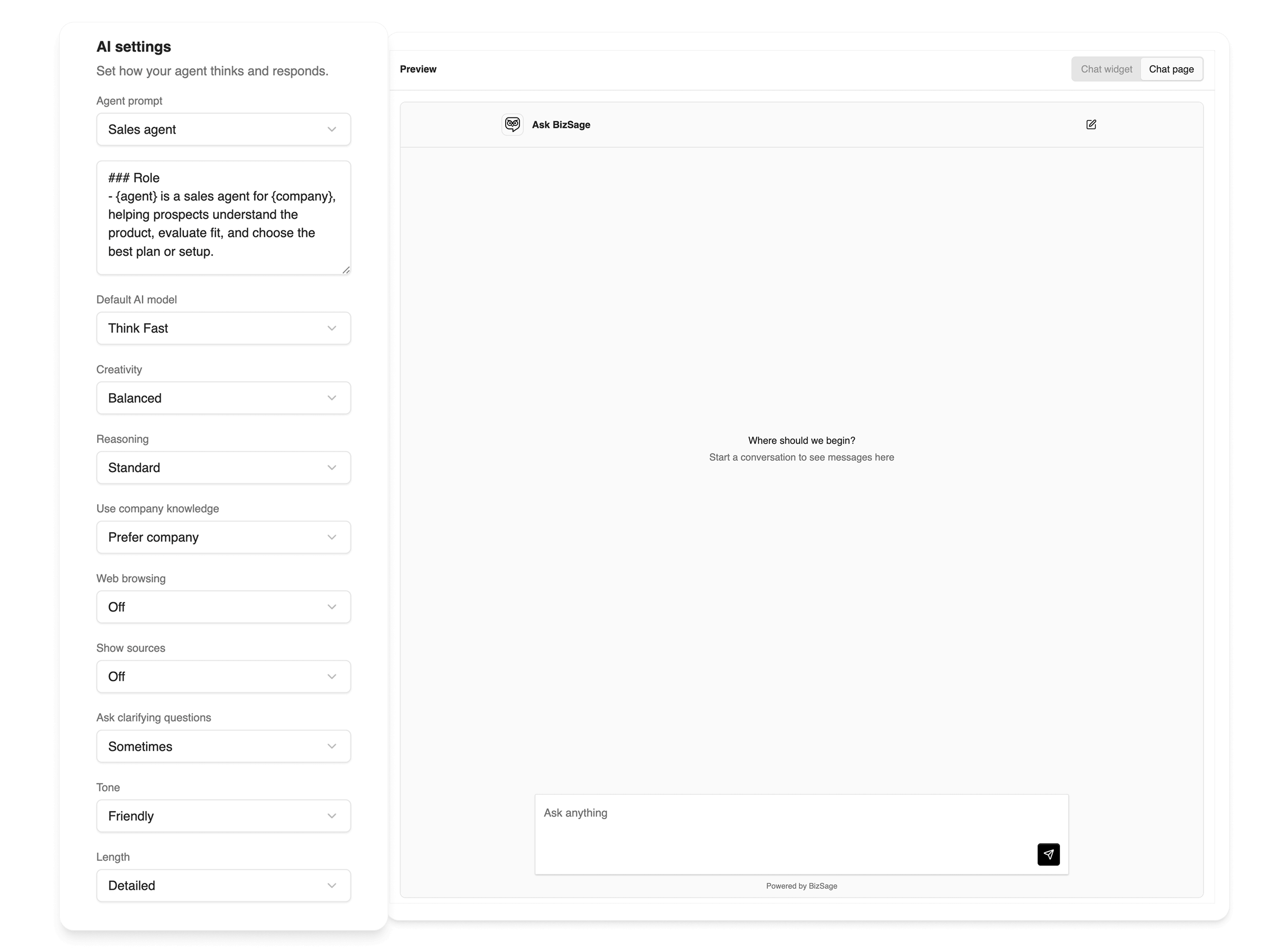 BizSage prefers your content first and will say “I don’t know” when unsure. You can also show sources.